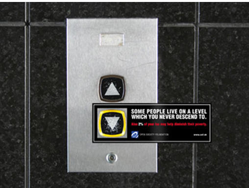 下面这幅作品是由捷克斯洛伐克的Mayer/McCann-Erickson公司为OSF基金会(the Open Society Foundation)创作的募捐广告。广告语是“一些人生活在你从来没有去过的(社会)底层”。广告就发布在电梯按钮的下行键上,既醒目又一语双关,很有新意也很有深意。不过,广告主题稍欠缺乏说服力。