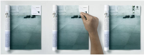 这是印度孟买JWT为印度1月7日的小儿麻痹日设计的杂志宣传。广告的焦点集中在一个非常小的角落,但这并不影响广告的效果。在页面右上角只画着一双鞋子,而鞋子的上面被遮住了。看到这些,人们一定会产生好奇心,想看看被折叠住的地方是什么。当他们把被折叠的地方打开后,就可以看到整个广告的真面目:一支因为小儿麻痹而留下后遗症的腿和一句广告语:万一你忘了……1月7日是小儿麻痹症日。
