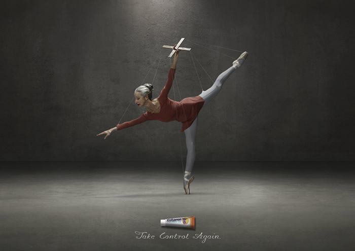 Voltaren(服他宁,一款消炎止痛药)自推出至今已有接近30年,是为瑞士诺华公司旗下一优质产品,广告中展示了芭蕾舞、卡波耶拉(巴西非裔移民所创的巴西战舞)、瑜伽三种舞蹈动作