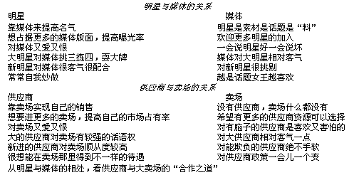 当前位置:中国广告人网站>创意策划>广告杂烩>详细内容 供应商与卖场 VS 明星与媒体的关系 作者:黄静 时间:2009-7-28 字体:[大] [中] [小]