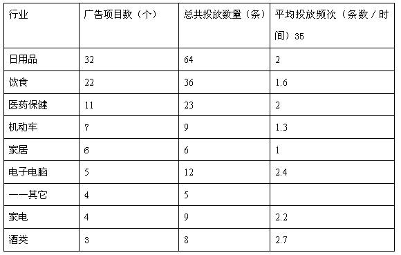 4、行业分布过宽,缺乏优势行业。从涉及行业看,整体上比较杂,大致涉及到了生活用品、鞋、服装、灭蚊用品、食品、饮料、医药、家装、化妆品、汽车、家电、手机等,其中从行业看和总投放频次看,日用品、饮食和医药保健行业广告为居前三,只是在不同广告时段里偏重的行业有所差异,不同行业的投放频次不同。