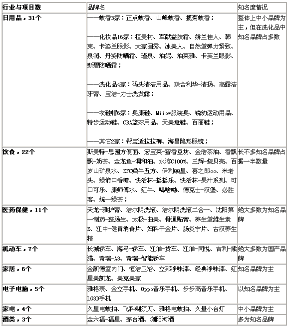 3、著名品牌所占比例偏低。就播出的品牌知名度看,不同行业中知名品牌和区域性中小品牌所含比例差异比较大,比如日用品和饮食,差不多各占一半,而医药保健相对来说知名品牌为主,机动车则几乎全部是国产品牌,这通过其中一期的客户名单就可以初步看出来,如下表所示: