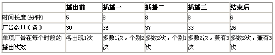 1、广告时段偏长,广告偏多,干扰度高。总广告时长为35分钟,总共分为5个播出时段,第一个时段为播出前5分钟,中间分别插播三次,各8分钟,播出后是一个6分钟的广告时段。