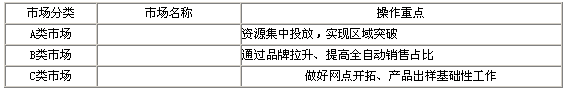 如将所辖区域划分成ABC三类市场,可概括为“区别主次,分类管理”。它将管理对象分为A、B、C三类,其关键在于区别一般的多数和极其重要的少数。其中A类市场为市场消费能力较高,商品在该区域的品牌认知度和形象基础比较好,代理商比较配合的市场,作为重点培养型市场;B类市场为相对A类市场而言较差一点的区域,作为稳步提升型市场;C类市场为下一阶段重点培养型市场。