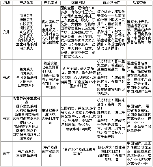 从产品上看,安井的产品可以以“全”来概括,产品体系完整;海欣可以用“点”来概括,重点突出“鱼丸”,这与企业“百年鱼丸世家”的诉求相切合;海壹可以用“特”来形容,除了有鱼糜制品、火锅系列等传统产品外,根据地方特色有推出“福州婚宴系”,根据粗粮的发展趋势推出“健康粗粮点心”,还有“海壹原创”,这是与众不同的地方。而百洋的产品就可以说是“杂”,一无产品系列划分,二还从事海产品养殖、加工与销售等工作,显得不够专一。但总体来说,产品无创新,同质严重。