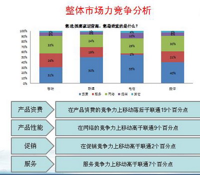2、 市场份额:市场份额的下降,是移动公司没有办法承受的。因为,谁都知道,客户一旦流失,也许就很难回头,想要翻身是非常不容易的事情。以前的联通有前车之鉴。