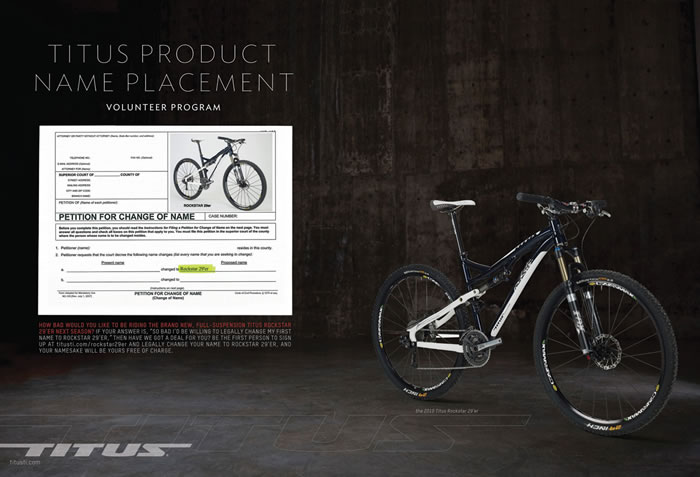 当前位置:中国广告人网站>创意策划>平面饕餮>详细内容 Titus自行车平面广告(1) 作者:佚名 时间:2010-2-20 字体:[大] [中] [小]