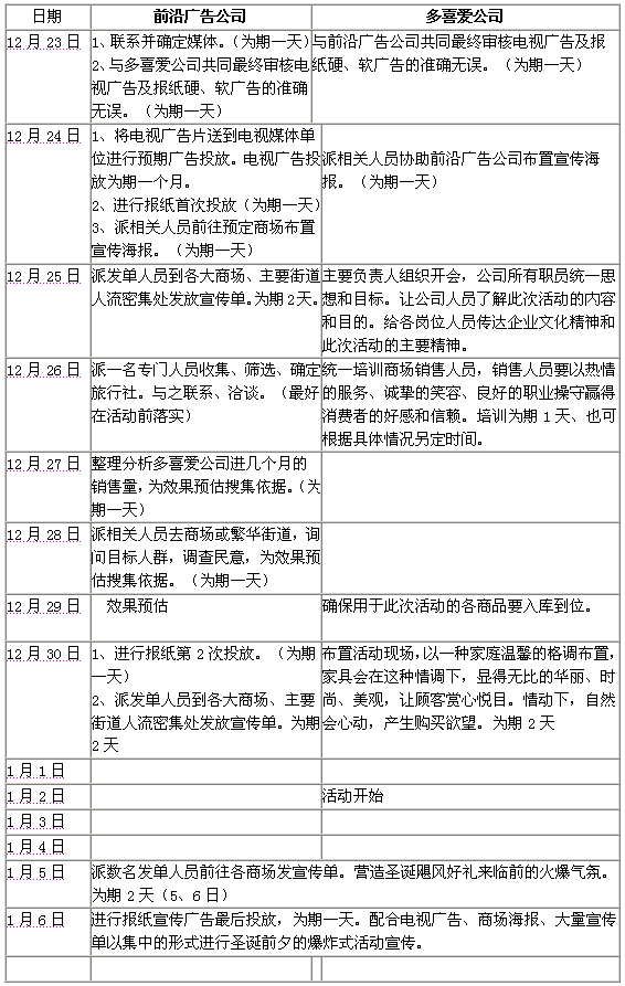 (4)、一切细节工作,待活动敲定后,双方工作进度推进表由前沿广告公司负责统筹〔后附工作进度表〕