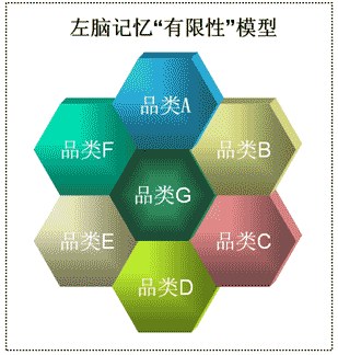 即人的左半脑仅仅能容纳一定量的内容。我们可以暂且把大脑想象成由无数个细小独立空间组成的“蜂窝”状的大空间,每一个单位的“蜂窝”我们可以把其看做某一类别或者某一属性的空间,而在这个单位“蜂窝”的空间里,只能容纳有限的内容,如果我们把某一单位“蜂窝”看做一个品类的话,那么这个品类的“蜂窝”里只能容纳几个品牌而已。当某个品类的“蜂窝”已经充斥了几个品牌后,你就不能再往里边钻,较为可行的方法就是寻找新的品类“蜂窝”。