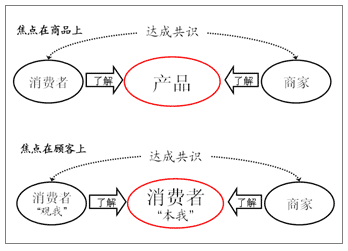 如果说传统的“营销”是商家和消费者把焦点集中在产品上的话,那么现代营销应该把焦点集中在消费者身上,再进一步讲,就是集中在帮“消费者对自我判别”的努力上。
