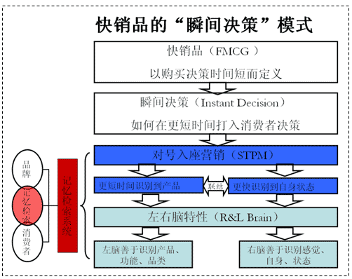 我们分析了“快销品”的最本质特征在于购买行为的“瞬间决策”,而在琳琅满目的快销品里,如何才能在瞬间“对号入座”让消费者选择您的产品呢?那就是针对对左右脑展开不同的“记忆检索”,使得消费者以更快的速度认知您的产品,认知他们的状态。