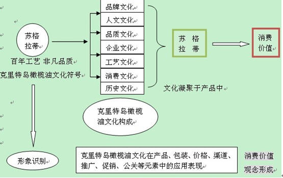 文化符号的诉求,不能仅仅是文化知识、文化解释和文化的传播,堆砌那些味同嚼蜡的历史和文化标识。橄榄油文化符号,必须转化、诠释、演绎成为消费者可以感受、品味和消费的价值文化。如洋河·蓝色经典的时尚文化、水井坊的高尚生活、芝华士的骑士文化。