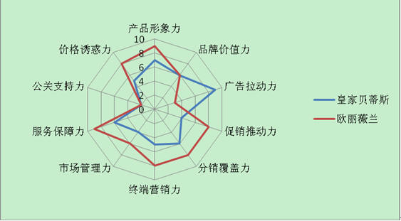 用颠峰十大竞争力模型来解读皇家贝蒂斯和欧丽薇兰,可以得出这两个橄榄油品牌的资源配比和竞争力分布: