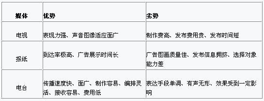 面对专业的广告客户,面对众多的媒体竞争,我们如何去向客户营销广播广告呢?在实际工作中如何运用广播广告推广的技巧?作为四川广播电视台广播广告部的一名业务主管,96年开始从事广告业务工作,现已有十五年了,因此我想从自身的实际工作中的经验体会对营销广告技巧上进行浅析说明。在众多的媒体竞争面前,想让客户从原来了解和习惯投放的媒体上接受新广告形式,无论是谁开始推广时都是有很大的困难,所以在让客户接受广播媒体前我们一定首先要对比各媒体的特点(见下表),让客户深入了解广播媒体的特点(卖点),最后达到媒体整合目的。