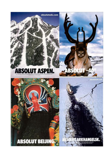 绝对伏特加就是一个鲜明的例证。伏特加的系列广告在业界可谓有口皆碑。其创意基点就是用一个简单的不能再简单的伏特加的瓶子形状作为诉求,应用到世界各地的各个角落。在伏特加的眼中,雪山是瓶子、球场是瓶子、鹿首是瓶子、悉尼的海滩里有瓶子、京剧脸谱里都有瓶子……但更为绝妙的是与视觉关联的标题和由此引发的奇想赋予了广告无穷的魅力。所谓大手笔大创意莫过于此。(见图5)