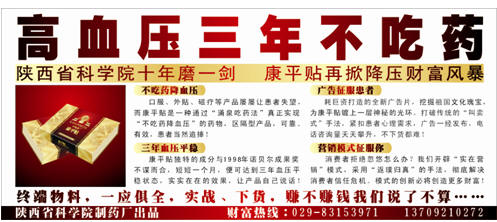 产品的“金身”已经打造好,就等着下海启航了。这时候的宣传推广策划至关重要,宣传推广策划的第一步是确定宣传推广的主题。又是一个头脑风暴会议,大家各抒己见,众说纷纭。宣传推广是直接面对患者的,宣传主题一定要是他们需求最迫切的,这就要求我们找准产品与患者之间最切合的交点。逆向思维让我们回到患者角度,他们饱受高血压的折磨,又屡屡对降压产品失望。他们迫切需要的是一个健康的结果,而不是方案。方案永远是一个美丽的故事,对于急功近利的消费者,结果才是最有吸引力的。正如营销界一个经典论述“消费者需要的不是一个凿子,而是一个孔”一样。我们的能给患者的“孔”在哪里?电光火石一般,我们想到了“三年不复发”,这不正是康平贴能给患者的“孔”么?这正是产品与患者之间完美的交点!但是转念一想,还觉得这个主题有点单薄,有所欠缺。大家一合计,国内消费者还极其关注的是“价格”。其他降压贴剂都是低价低质形象,为了维持、丰满康平贴的高质形象,必须走“高性价比”策略,即购买一个月康平贴的费用为888元,可保高血压3年不复发,计算下来每天花销才不到6毛钱,这就是“高性价比”战略。宣传上,888元可以吸引更多的眼球和联想。根据消费者关注的两大方面结合起来,我们的丰满且充满诱惑力的宣传主题出炉了:“康平贴六百六十八,高血压三年不复发。”