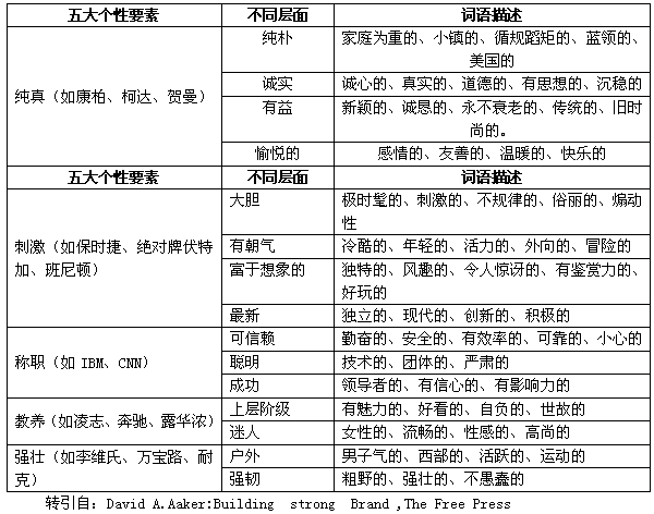 一个品牌有哪些个性呢?这里首先介绍一下品牌专家大卫•艾克在品牌个性研究方面的成果。它使用了品牌个性尺度(BPS,Brand Personality Scale)对1000位美国受访者、60个具有明确个性的品牌展开调查。这项调查使用五大个性要素“纯真、刺激、称职、教养和强壮”几乎可以解释所有品牌(93%)之间的差异: