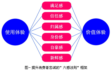 找到“六感”,我们就知道到底是什么将我们的“使用体验”推向“价值体验”。因此,我们暂时省略“感性体验”与“理性体验”的细分环节,把图进一步简化,就可以得到下面的这张图,即:“提升消费者忠诚的‘六感’法则”基本框架(如下图)。