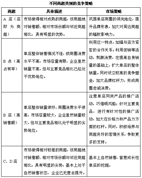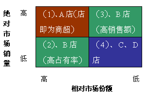 当企业实施“市场渗透战略”及“产品开发战略”时,按照主观分类法,以绝对市场销量和相对市场份额为两个纬度,可以得到以下四个终端商超——A店、B店(高占有率)、B店(高销售额)、C、D店。四个终端商超各自有不同的特性,及相对应的市场竞争策略。