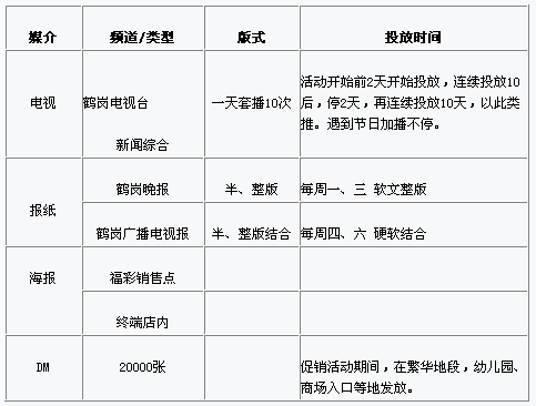 采取电视、报纸、DM、POP与大海报相结合的广告宣传方式,以优劣互补,时间互补,有效发挥组合营销特色。全方位影响消费者。前期造势、传递信息、提高知名度,树立良好的品牌形象,并配合促销活动,来提高销售业绩。