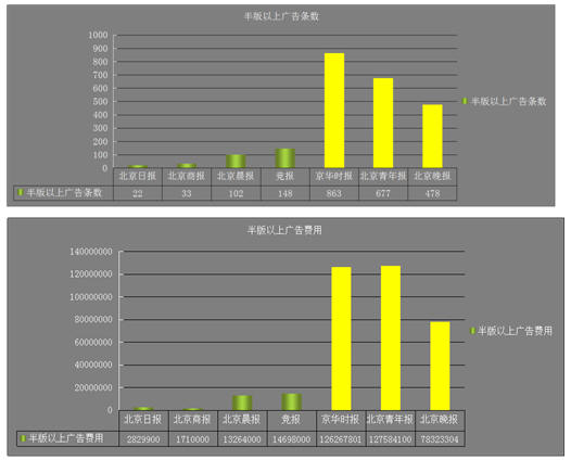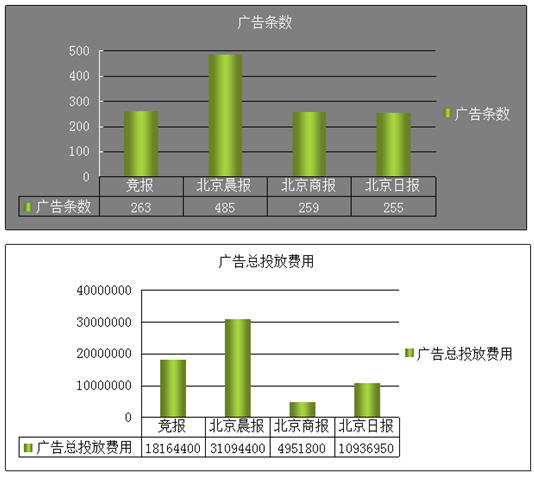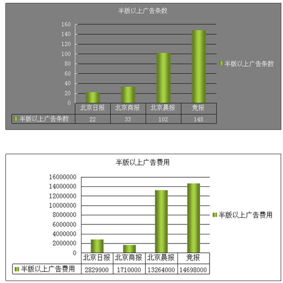 值得指出的是,《北京日报》半版广告费用为2829900元,而总广告费用为10936950元,所占比例为25.87%;《北京商报》 广告费用为1710000元,总广告费用为4951800元,所占比例额为34.53%; 《北京晨报》 半版以上广告费用为13264000元,总广告费用为31094400元,所占比例为42.66% ; 《竞报》 半版以上的广告费用为14698000元,而总广告费用为18164400元,所占比例为80.92%。
