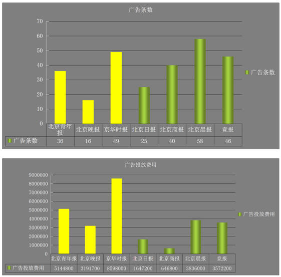 从上面的图表可以看出,这四家报纸的广告总投放量并不是很多:一方面,这个月的广告总条数很少。最多的不过是《北京晨报》,才485条,其他三家均为250多条;另一方面,广告总投放费用很低。其中《北京商报》更是连500万的广告总投放费用都无法达到,《北京日报》为1000多万,《竞报》为1800多万。而《北京晨报》为3000多万,为这四者最高。我们再拿京城经营规模前三大报纸《北京晚报》《京华时报》(它们为北京日报报业集团旗下报纸)和《北京青年报》的相关数据与这四者进行对比,相信读者能更深刻理解这四份报纸目前在京城报业中所处的边缘地位了。