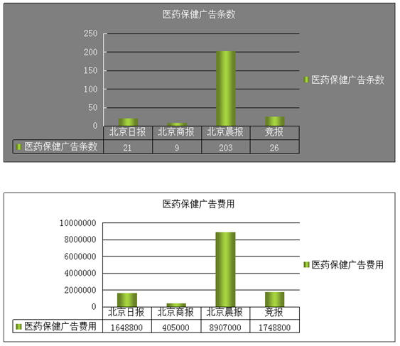 众所周知,我国医药保健行业目前缺乏有效的积极的健全的监管机制。因此,这方面的广告水平与质量也很参差不齐,广告主的质量也相比机动车、家电等行业逊色不少。为此,我们专门将医药保健行业广告进行单独分析,借此希冀可以在一个侧面看看这四家报纸的广告经营现状。