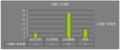 根据监测中心的数据,《竞报》问题广告条数为9条,所占比例为3.42%;《北京晨报》 问题广告条数为27条,所占比例为5.57%;《北京商报》为0条;《北京日报》为5条,所占比例为1.96%。其中《北京晨报》的问题广告最多,所占比例也为最大。其他三份报纸虽然比例较小(据我们统计的数据,《北京商报》没有问题广告),但是其广告总量很小。我们可以看出这四份报纸经营方面处于弱势而且比较混乱,尤其是《北京晨报》,用一句不太恰当的比喻来说,显得有些“饥不择食”。如下图: