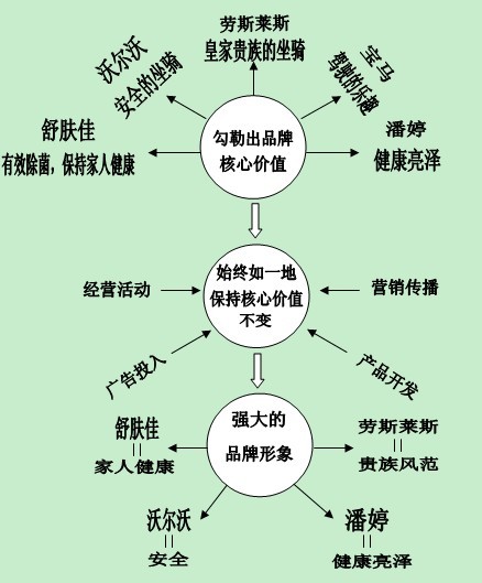 劳斯莱斯是“皇家贵族的座骑”;宝马则是“驾驶的乐趣”;沃尔沃定位于“安全”;万宝路“勇敢、冒险、激情、进取的男子汉形象(以剽悍、坚毅西部牛仔这一视觉形象为主要载体)”;金利来代表着“充满魅力的男人”……以上就是这些金字招牌的核心价值定位。品牌核心价值一旦确定便被咬住不放持之以恒地贯彻下去,企业的所有营销策略都要围绕核心价值而展开,几亿、几十亿的广告费是对核心价值的演绎,尽管广告不停地换,但换的只是表现形式。沃尔沃宣传的重心一直是“安全”,从未曾听说沃尔沃头脑一发热去宣传“驾驶的乐趣”。久而久之,沃尔沃品牌在消费者大脑中就有了明确的印记,获得独占的山头。但这不是说宝马就不够安全,驾驶沃尔沃就没有乐趣,而是在核心利益点的宣传过程中必然要有主次之分。沃尔沃能成为2000年全美销量最大、最受推崇的豪华车品牌,与其对品牌核心价值的精心维护及在企业的经营活动中忠实地体现核心价值是分不开的,不仅投入巨资研发安全技术,在广告、事件公关总是不失时机地围绕着“安全“的核心价值而展开。