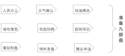 1、人员分工:成立促销活动“常委会”,对活动准备期进行明确分工。