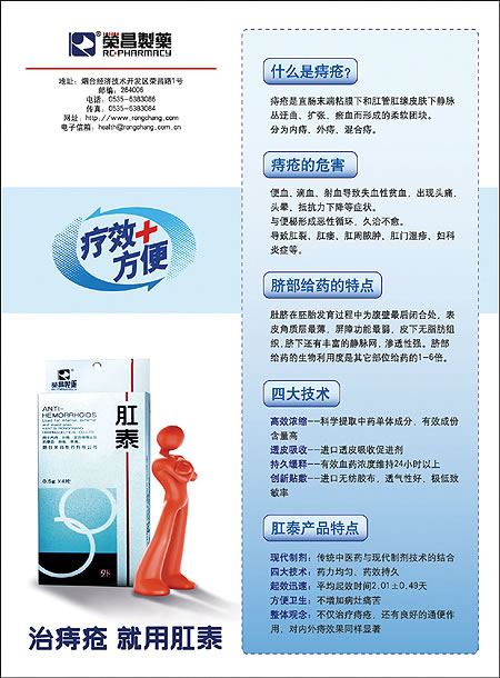 肛泰(贴剂)脐融片这一全新理念剂型运用了脐部给药的特性,具有了口服药和肛门局部用药的全部优点,克服了这两种用药方法的缺点。相对于肛门局部用药来说,脐部给药更方便、无痛苦;药物有效成分可充分、全面地发挥作用。相对于口服药来说,脐部给药是使药物成分通过脐部进入体内,直接进入血液循环,避免了肝脏、胃肠对药物成分的破坏,同时药物对肝脏、胃肠的刺激等副作用也大大降低,并且脐部表皮角质层很薄,皮肤敏感度高,脐下还有丰富的静脉血管网,渗透性强,吸收好。实验证明脐部透皮给药生物利用度高,是其他部位透皮给药的1~6倍,所以效果发挥得非常充分,疗效好,副作用小。一上市也获得广大消费者的认同。