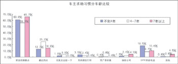 5.紧急情况下,车主求助习惯分车龄比较。SVW的求助电话使用率4年以下车主使用率最高,4~7年车主使用率最低,相应地4~7年的车主去常去的维修点的比率也低,而就近的比率却很高(见图5)。