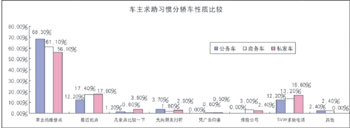 4.紧急情况下,车主求助习惯分轿车性质比较。SVW的求助电话使用率基本相同,公务车对常去的维修站的依赖较大(见图4)。