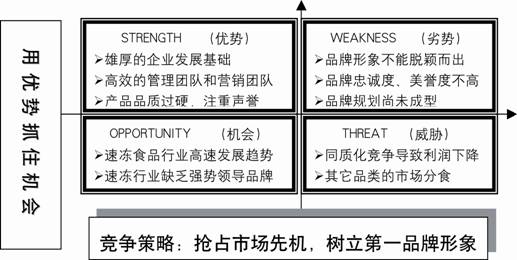 对竞品进行抢先占位就必须找到当今的速冻食品行业具有排他性、优越性的概念领地,并且思念自身的资源优势能够支撑这个领地,在此我们对思念品牌进行了如下SWOT分析: