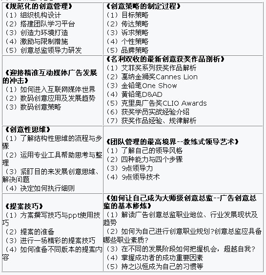 培训由资深教授和广告创意实战专家共同授课,将导师讲解和学员交流融为一体,通过简明理论解释、现场案例剖析、实战经验分享等多种形式,使学员获得实战实务的广告创意知识,实际实用的学习效果。