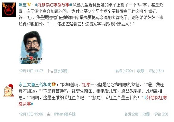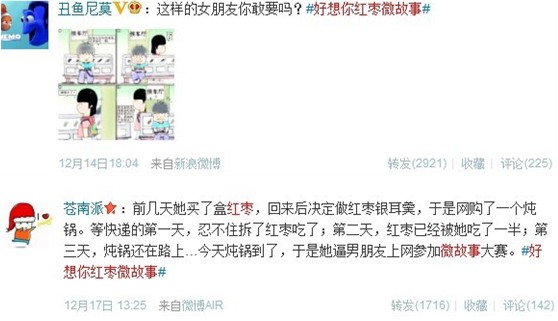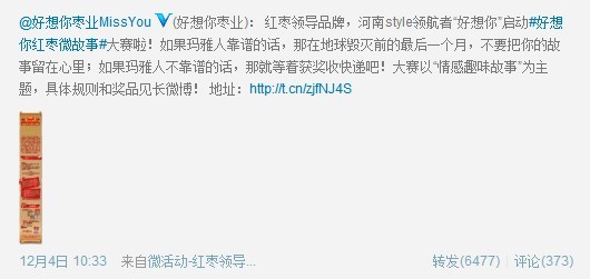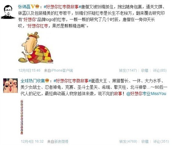 首先于12月3日通过好想你官微发起#好想你红枣微故事#大赛活动,围绕“好想你红枣”创作情感微故事,并设一等奖(红枣奖)1名,二等奖(洗澡奖)3名,三等奖(搓枣奖)10名,另有响应的奖品奖励,提升参与者的积极性。然后通过@传媒老王、@赖宝、@张锡磊、@全球热门精选榜、@三峡在线、@木尔、@田桑、@东土大唐三俗和尚等大号或段子手转发带动人气。