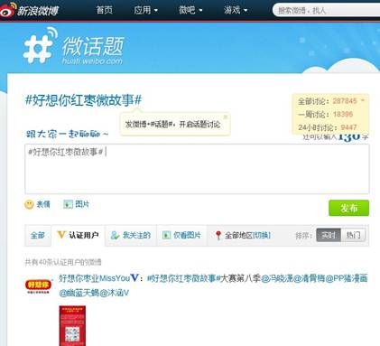 “好想你”是大众词汇,直接说好想你,难以联想到红枣,但“红枣领导品牌”又太长,影响话题传播,综合考虑最终用#好想你红枣微故事#作为话题,进行段子营销。