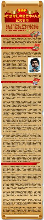 同时还进行了活动盘点,发布了《十大爱情故事》、《十大趣味故事》、《十大经典故事》以及与好想你、红枣或销量领先结合最紧密的故事《十大最“好想你”故事》。最终@赖宝、@苍南派、@东土大唐三俗和尚、@田桑等知名获得相应奖项,而大部分获奖作品都是网友原创作品,而非只选大V或段子手。