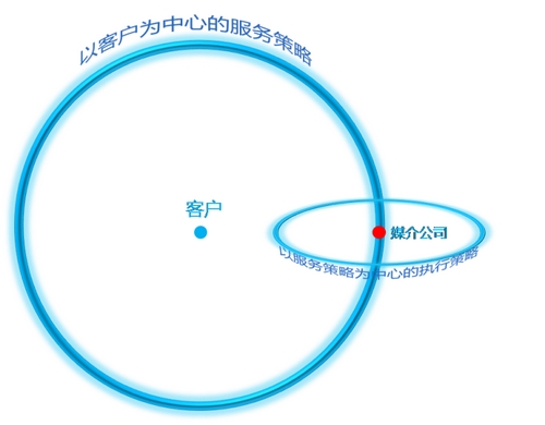 根据以上论述,我提出自己的媒介服务的“生态循环流程系统”(如右图所示):此流程是以上面的3大核心、5大原则为基础,参考地球天体运动为蓝本,因为万事万物都有规律可循,都是依照大自然的规律去生长壮大。而我们的媒介服务流程正如地球绕太阳运转的规律相似:地球是媒介服务公司,太阳是客户。我们的媒介服务外要“以客户为中心的服务策略“这条轨迹进行公转,内要”以服务策略为中心的执行策略“进行自转,以此达到整个生态系统的循环发展,生生不息。