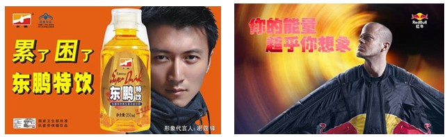 红牛在前一阶段,一直和消费者进行功能诉求:困了累了,喝红牛!但考虑到会暗示消费者只有困了累了的时候才能喝,于是期间改变了多次广告语。如“补充能量,精力十足”、“ 有能量创造新传奇”等。目前红牛又打出了新的广告诉求“你的能量,超乎你想象”。在这样的背景下,东鹏直接用了红牛之前的广告语“困了累了,东鹏特饮!”这种诉求可以提醒大家该喝东鹏了。但同时,消费者会自然想到“抄袭红牛”,或者会想到东鹏不过是“山寨”而已。