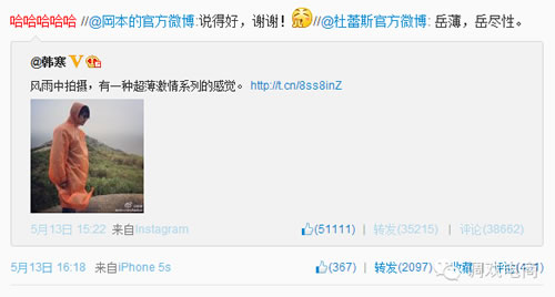 5月13日15点22分,韩寒发布了一条微博:“风雨中拍摄,有一种超薄激情系列的感觉。”配上一张穿着简易雨衣的照片。这原本是一件与行业并无太大关联的事情,但坐拥3800万粉丝的韩寒每一条微博都是段子手和造势者的战场,“超薄激情”与“雨衣”两个概念马上勾起了两大套套品牌的神经。