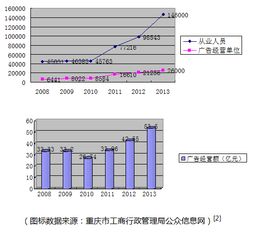 根据重庆市政府网站的权威数据,2013年底,重庆市有各类广告经营单位2.6万户,广告经营额53.5亿元,同比分别增加23.8%和25.9%,全市广告经营额约占GDP比重的0.42%;有广告从业人员14.6万人,同比增加47.5%。2013年,重庆广告市场主体总量和广告经营额继续大幅上扬。[1]