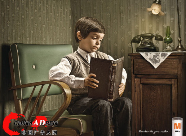 PS:没有虚伪做作大明星,没有虚假煽情的广告词,却以好的创意让大家了解了它记住了它。小男孩在读弗里德里希·威廉·尼采的现代哲学,小女孩在读西格蒙德·弗洛伊德的著作。人家这牛奶肯定不含三聚氰胺!!