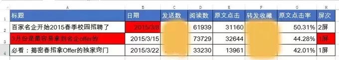后来,我就继续在文案上下功夫,打算第二周的时候再上一个新台阶。因为我觉得阅读数还能有所提高,果然,第二周的时候内容还是差不多,但是标题文案我改成了“三月份是最容易拿到名企offer的”,这个文案果然发挥了威力,阅读数提高了10000多。后来我就琢磨了一下,之所以提高了阅读数,是因为这篇文案的标题是以用户为中心的:应届生只渴望拿到Offer,我给了他们一个拿Offer最好的月份,谁会拒绝名企高薪的Offer呢(这个标题还暗合了一条有关好文案的公式,下文说)。后来第三周我又试了一条文案:必看:揭秘春招拿Offer的独家窍门,主打神秘牌,结果大跌眼镜,阅读数足足比上两篇少了一半。标题党在这里不好使了。
