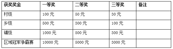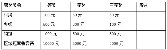2、此次比赛分初赛、决赛和区域冠军争霸赛;以村为单位开始初赛,胜出者代表村参加乡/镇级比赛,再胜出者参加县/区级比赛,最终参与冠军争霸赛。