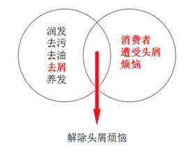如右上图,自身产品与竞品都具有去屑功效,消费者的痛点仍然是头屑困扰,我们称之为“原生痛点”,但解决头屑问题的同时,又衍生出诸如头屑没完没了,常反复,去头屑的洗发水伤头发等痛点,我们称之为“次生痛点”,产品所具有的特点就是解决次生痛点的唯一有效途径,这样,去屑的产品功效点与不伤发的产品特点的结合点“去屑不伤发”,就形成了产品的差异化卖点,与竞品的“去屑防反复”的卖点,形成了有效市场区隔,满足了遭受伤发困扰的细分人群的去屑需求。