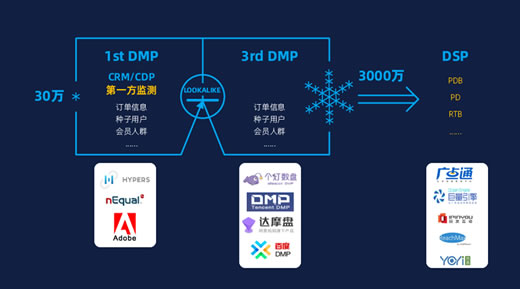 如上图,企业第一方数据相当于精准的Y值,DMP服务方则是拥有海量的X值。当一个品牌根据其第一方数据锁定目标人群后,品牌主就能依托DMP服务方的海量数据基础,利用look-alike算法进行人群扩量,从而找到更多的潜在目标人群。例如,今年5月我们就帮助某欧洲品牌奶粉,将其30万会员进行相似人群扩量,最终找到了3000万的目标人群,从而在确保触达精准用户的前提下,助力品牌影响更多的潜在目标人群让品牌“营销”释放更大的能量。