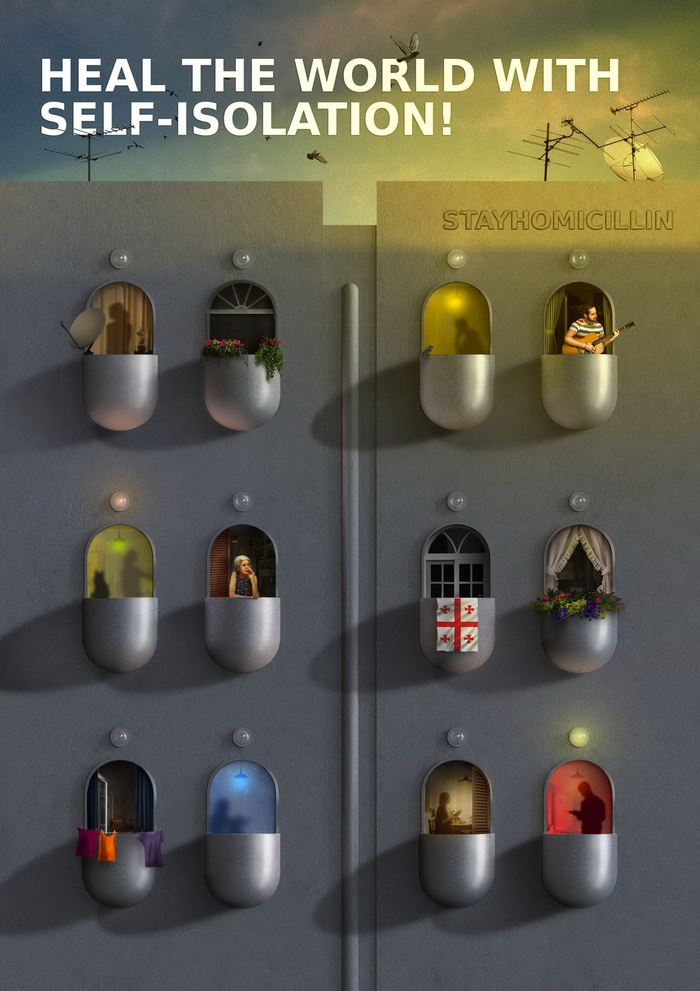 新冠病毒平面广告:通过自我隔离来治愈世界!