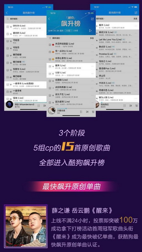通过与节目进程和内容的深度结合,节目内的原创歌曲也成功引爆了酷狗音乐用户的热情,酷狗音乐人气排行榜前三首歌曲总计获得764万投票,15.6万评论。节目内原创歌曲《醒来》上线不满24小时,投票即突破100万,成为最快破亿单曲,获酷狗最快飙升原创单曲认证。