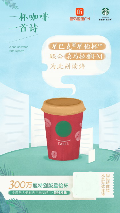 不久前,喜马拉雅首次与星巴克跨界合作推出了300万杯“为此刻读诗”的限量星怡杯,在营销界掀起不小的轰动。合作之初,星巴克就希望借助喜马拉雅上对其高端目标受众实现高覆盖。而喜马拉则用自身的流量以及海量音频内容优势,赋予了星怡杯全新的听觉体验。让广告不再是打扰而是打动,对用户的情感进行了强关联。让原本可能被低估和忽略的听觉体验再次受到重视,走红今夏咖啡饮品圈。